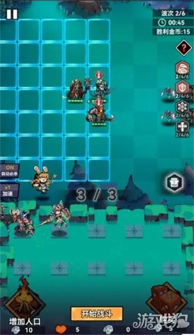 进入战斗后,需要先购买英灵上场才能开始战斗。初始为3人口,增加人口需要花费金币购买!波次胜利可获得15金币并进入下一波次,失败则扣除1血量并获得5金币补偿重新挑战当前波次,血条为0则突围失败!只有通关所有波次才能获得最终的胜利!