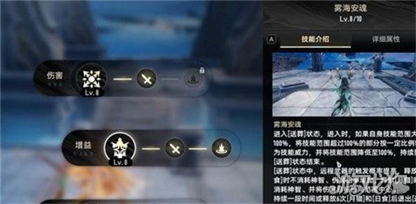 妮弗尔夫人的增益技为雾海安魂,它能让妮弗尔夫人进入送葬状态,该状态会基于妮弗尔夫人攻击范围溢出的部分来对她的技能进行强化,溢出的部分越多,强化效带来的加成也就越高,使用伤害技时也不再消耗神智,且日食的伤害倍率会得到增加,释放月猎时会获得一定的聚怪效果。当送葬的持续时间结束后,亦或妮弗尔夫人累积释放了6次日食、月猎,那么她就会退出送葬效果,该效果所带来的加成也会立刻结束。