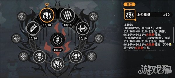 重击技能上勾重拳在直接施放时能造成127.36%+84.91%短兵伤害,并附加96.16%+64.11%的火元素侵染。在普通攻击第一或第二段后施放,虽然伤害不变,但最后一段会转化为纯粹的火元素伤害。在第三段后施放则能造成更强大的127.36%+84.91%火元素短兵伤害以及96.16%+64.11%的火元素侵染。