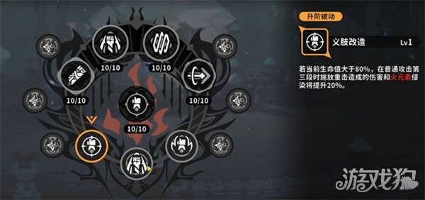 维吉尔的升阶被动技能进一步强化了他的战斗能力。义肢改造使他在生命值大于80%时,普通攻击第三段施放重击的伤害和火元素侵染提升20%。全力一击让他在使用重击时对敌人额外造成67.50%火元素短兵伤害和36.00%的火元素侵染。修理完成被动在连携追击出场时能恢复自身10%的生命值,冷却时间仅为20秒,提供了不错的续航能力。