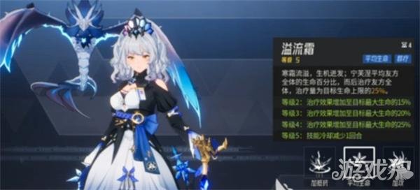 宁芙涅为友方全体附加两回合攻击上升以及免疫,同时附加两回合等同于自身25%最大生命的霜花,霜花能够吸收等量伤害且持续期间攻击提升40%;技能主目标的霜花维持回合+1