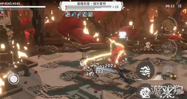 提尔雷特是一个火元素的boss,她的血量非常的厚,足足有18层,在战斗开始以后,玩家可以先切换纳叶上场,纳叶是输出型的的角色,一套攻击可以直接把提尔雷特的血量打下一去一层,提尔雷特的血量到了16层的时候会进行反击,她先会挥舞手中的巨剑跳起来径直辟向对手,这个技能玩家只要躲避就行了,把该技能躲避以后可以在继续进行一套输出。