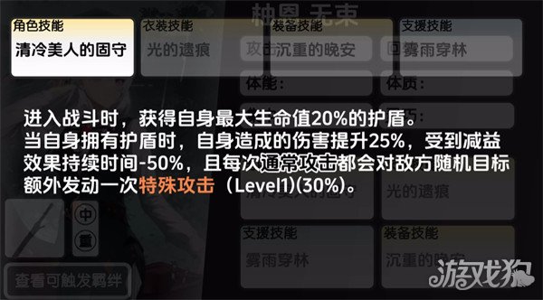 柚恩角色技能上面可用的是清冷美人的固守这个技能,效果是一到进入战斗时,柚恩就可以获得自身最大生命值20%的护盾,当她自身拥有护盾时,可以造成的伤害就会提升25%,切受到减益效果持续时间-50%,这里只要是技能生效那么每一次通常攻击都会对敌方随机目标额外发动一次特殊攻击,所以算是一个通常攻击的强化效果。