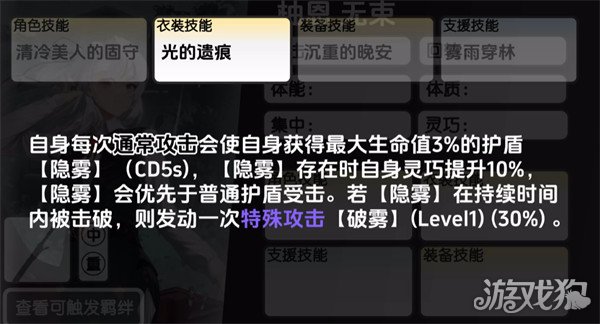 衣装技能叫做光的遗痕,只要是柚恩使用这个技能,那么每一次使用通常攻击的时候,都会使她自身获得最大生命值3%的护盾【隐雾】,这个护盾的持续时间是达到了5s的,而【隐雾】属于她的一个专属状态,生效的时候只要存在场上,那么柚恩自身的灵巧会提升10%,然后【隐雾】会优先于普通护盾受击,如果【隐雾】在持续时间内被击破,则发动一次特殊攻击叫做【破雾】,输出也有30%左右的提升效果。