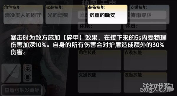 装备技能大家可以选用沉重的晚安,有了这个技能效果柚恩就可以在暴击时为敌方施加【碎甲】效果,在接下来的5秒内受物理伤害加深10%,且她自身的所有伤害会对护盾造成额外的30%伤害。柚恩最后的支援技能叫做雾雨穿林,这个支援的效果是当己方有角色护盾被击破时就可以触发技能的能力,此时柚恩会发动一次特殊攻击【破雾】带来输出,但是这个支援技能的效果是每8秒只能触发一次的,所以大家要计算好使用间隙。