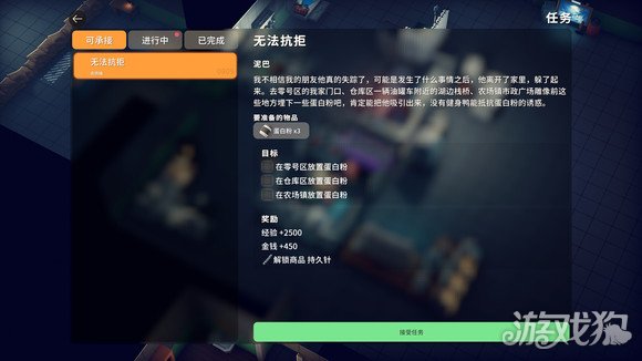 玩家可以通过提交需求物品来完成任务,获得持久针X1。