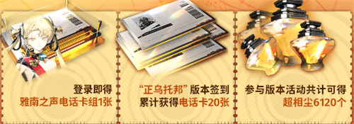 2、领取免费月卡物资:登录游戏即可获得“雅南之声”电话卡组1张;“正乌托邦”版本签到累计可获得电话卡20张;参与版本活动共计可获得超相尘6120个。