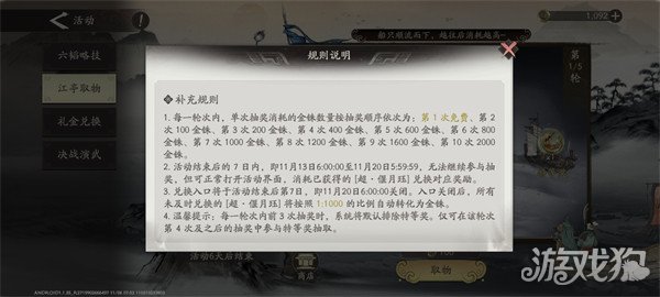 江亭取物活动采用类似转盘的抽取机制,奖池内共设有10个不同等级的奖励。玩家首次抽取可免费进行,后续则需要消耗金珠才能继续参与抽奖。随着抽取次数的增加,每次所需的金珠数量也会逐步攀升,需要合理规划资源。