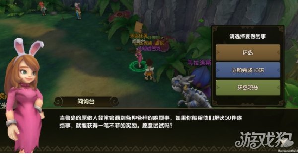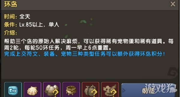 目前环岛的任务类型主要分为对话、战斗,上交装备、上交符文、上交宠物五大内容。
