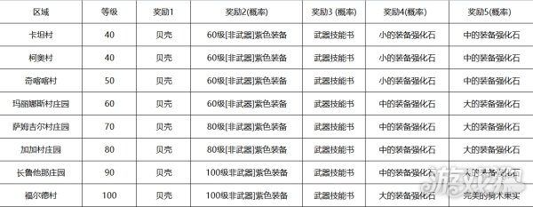 奖励内容:经验、白贝、武器技能书、随机装备、装备强化石、完美的骑术果实