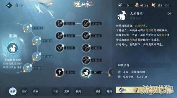 3、完成奇遇以后我们打开【菜单-身份-采摘-技艺页面】在右下角可以看到【大宋驿丞】的隐藏身份,点击并升级该身份。