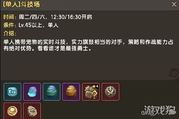 进入条件:Lv45(每周二/四/六,12:30/16:30开启)活动→限时→[单人]斗技场