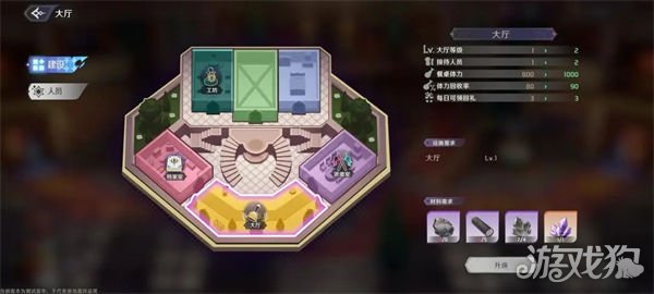 大厅区域的餐桌处能够不断积累体力,当体力不足的时候,即可来到城建-大厅补充额外体力;在档案室中,我们可以增加与其他卡牌角色的亲密度,领取各类成就奖励以及查看各位角色所在的阵营图鉴;在派遣室中,我们可以指派卡牌角色完成各类派遣任务,获得对应的派遣任务奖励;在工坊页面中,我们也可以获得材料图纸制作对应的材料道具。