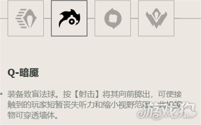 Q-暗魇——可以让前方一定范围内的所有人暂时失去听觉,视野也会严重受限。幽影的Q技能相对于不死鸟、夜露的闪光D来说,致盲效果要逊色不少,但暗魇的穿墙和范围效果,以及可以让对方失去听觉从而无法听到己方的脚步声,这些特性则使其成为协助团队发动进攻的神技。