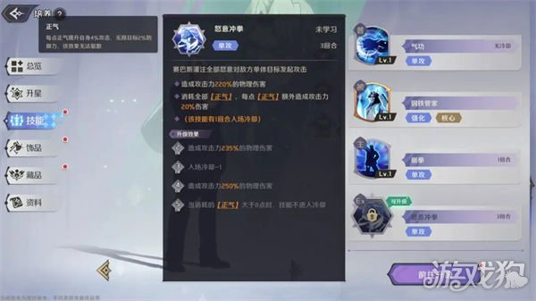 单体物理攻击,冷却3回合,造成高额的物理伤害,消耗全部的【正气】点数,每点【正气】额外造成攻击力20%的伤害。该技能5级时获得新的效果:消耗的【正气】大于8点时,技能不进入冷却。高爆发技能,本身拥有极高的伤害比例,还可以消耗【正气】获得额外伤害,技能5级以后可以同一回合使用2次,打出爆炸输出,针对boss具有奇效,在竞技场中也可以体验一拳秒人的快感。
