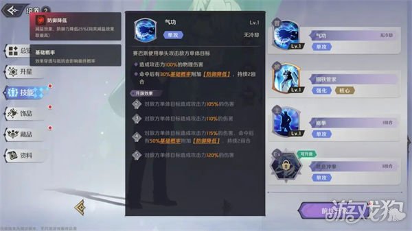 单体物理伤害,冷却1回合,命中后最多可额外获得3点正气。高额的伤害比例+额外正气,使得该技能可以打出很高的输出,配合普攻的【防御降低】效果,进一步提高赛巴斯的输出能力。