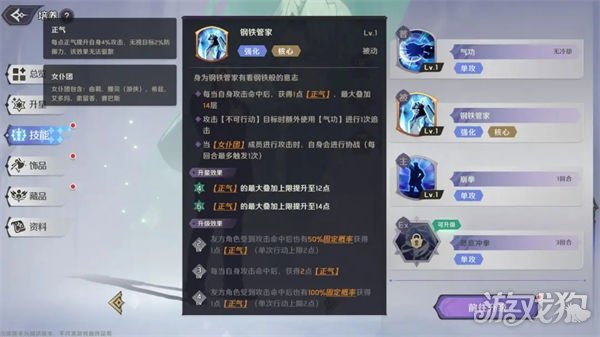 每次攻击命中获得1点【正气】,技能升级后,友方角色攻击时也有概率获得【正气】,当【女仆团】成员进行攻击时,自身会触发【携战】。【正气】:每点提高4%攻击,无视目标2%防御,无法被驱散,最高可叠加至14点。该技能为赛巴斯的核心技能,通过【正气】的叠加,大幅度的提高赛巴斯的攻击力和无视防御能力,使其能够打出高额的真实伤害,无论面对脆皮输出还是肉装坦克都可以轻松应对。