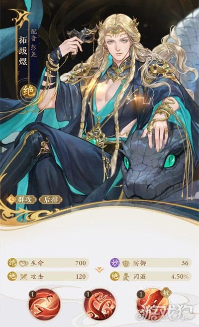 拓跋煜的技能可以对目标施加瘴气状态,并利用瘴气造成持续伤害。他的普攻技能梦魇可以重置目标瘴气状态的持续回合,并对目标造成瘴气伤害。大招万蛇窟则是一次强力的群体攻击,可以对全体目标造成大量伤害并使其进入瘴气状态。同时,拓跋煜的被动技能蛇舞可以增加他的输出能力,对处于瘴气状态的目标造成额外伤害。