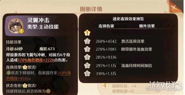 飞翼咪·乌影的技能需要60秒的冷却时间,这个时间是固定的,消耗673点魔力后开启,技能【灵翼冲击】:飞翼咪会释放蒙养的飞翼鸟,冲刺后会对前方6名敌人造成170%的角色物攻,额外增加2228点伤害,在飞翼咪强化到2星的时候技能会激活连锁反应。