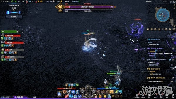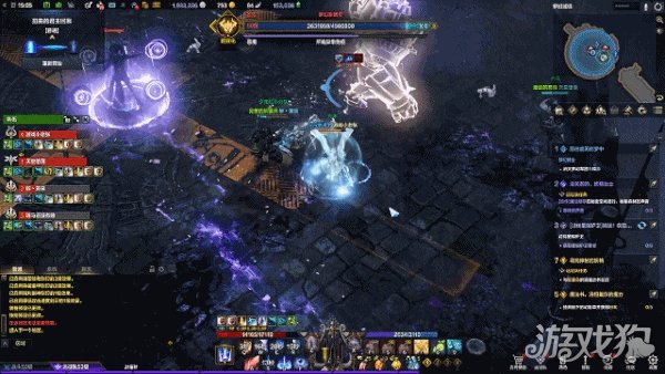其次,当BOSS血量下降到一定程度时,会开启团灭机制。处于该机制时,屏幕下方会出现“对话框”提示,三名冒险家被“宣告结束”状态点名,脚下出现大范围紫色光圈,剩余一名冒险家头顶会出现“瞄准标记”提示,同时“梦幻军团主教”会在场景中间引导团灭机制且无法被打断。