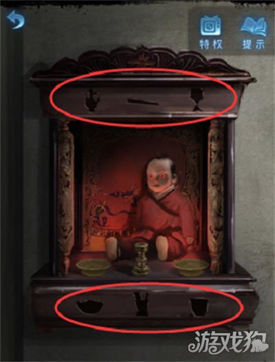2、线索就在神龛上下的位置,一共有六个镂空的图案吗,正好对应柜子上的物品;