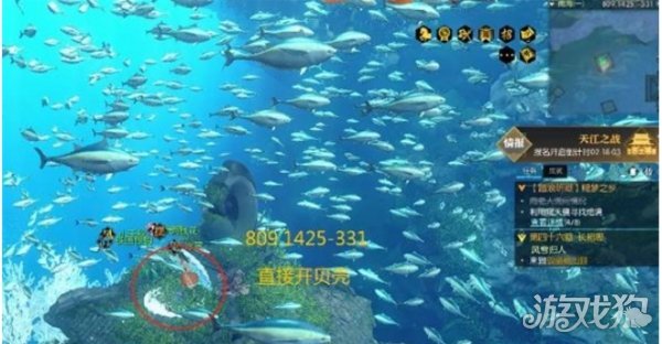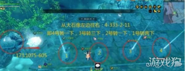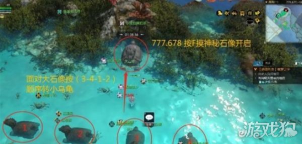 第三天的位置:(173.1075-605)游到坐标点下潜,我们需要先膜拜神像,从大石像左边往右,按照4333211的顺序转动小乌龟掉落的贝壳我们打开之后会获得粉蝶贝*8;