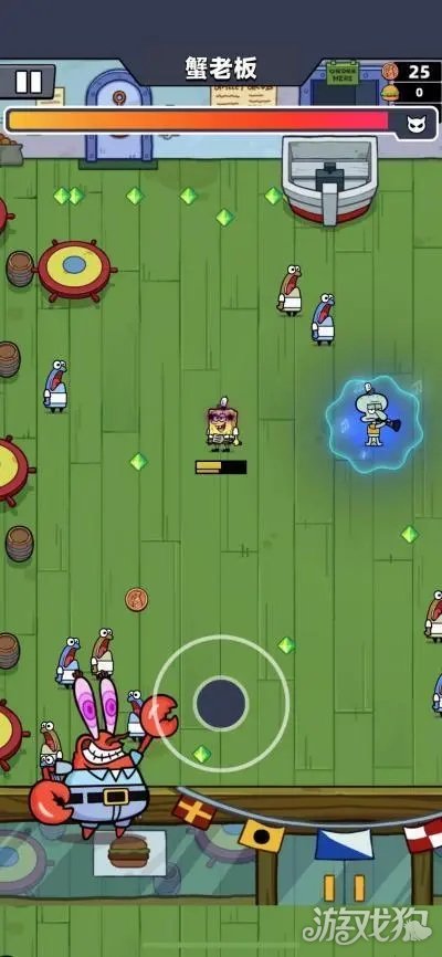 3、虽然章鱼哥会“帮倒忙”,但是他的音乐能够驱散蟹老板召唤出的凤尾鱼,为海绵宝宝创造进攻的空间。在关卡中,海绵宝宝只能使用自己的初始武器【锅铲】进攻,场地会随机刷新出经验宝石供大家来升级。