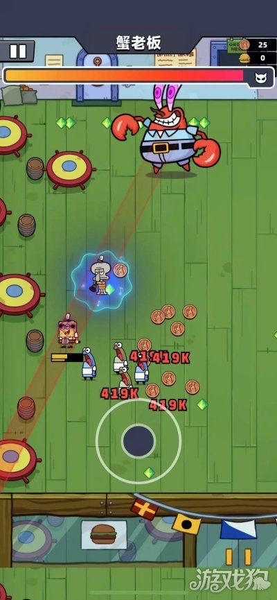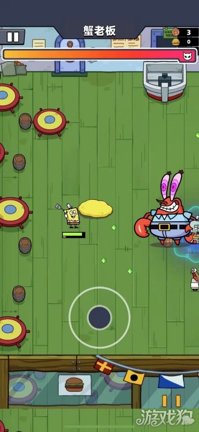 2、其实通关的关键还是在于对距离的把控,场地中除了海绵宝宝与蟹老板以外,章鱼哥也会进行助战,章鱼哥使用的武器单簧管会发出干扰音乐,一旦海绵宝宝触及到这个范围之内就会陷入“迷糊”状态,无法辨明方向,所以在交战时,一定要避开章鱼哥。