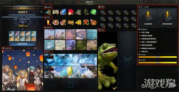 冒险家们可以通过快捷键“N”查看冒险之书,由任务、怪物、首领、料理、观景点、地牢等部分组成。