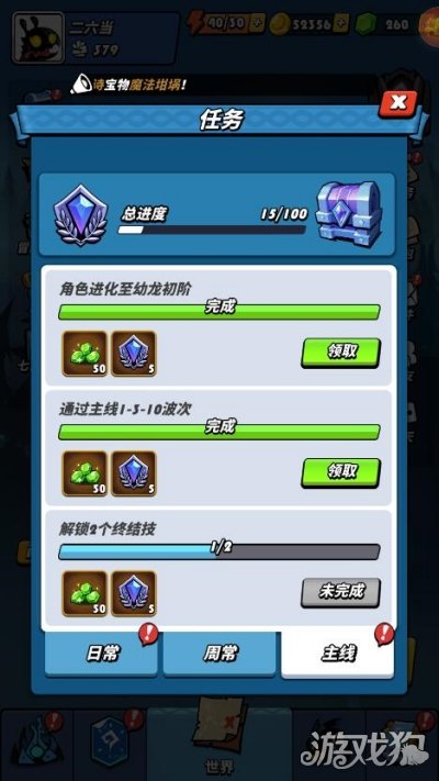 点击游戏界面右侧的任务图标,然后我们找到主线任务,如下图,完成角色进化、主线挑战以及终结技解锁也可以获得奖励。