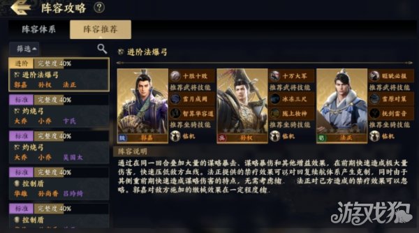 这套法爆打法无论是观赏性还是实战能力都堪称一绝,首先郭嘉可以降低敌人法术防御,法正又可以提高己方队友的法术暴击与伤害,两者相加之一,敌人将变得很脆,友军的伤害则因此变得更有质量,而这套里面用的一个主C是孙权,他的伤害倍率是十分夸张的,在吃到法正的buff之后能够轻松打出爆炸伤害。当然,因为有时会碰到一些拥有高额减伤的肉盾阵容,所以这个时候还需要带上诸如“冰冻三尺”这类开局就能打伤害的技能先行压低对手血线,这样后续的buff给完,防御削完才能够确保孙权的爆发能够造成实际威胁。