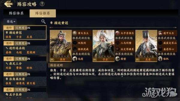 首先这套阵容可以组成循迹黄冠的羁绊,这一羁绊能够显著提升整支队伍的伤害,而恰好阵中这三人都是以打伤害为主的,其中张角是最为核心的一个角色,他的技能可以为其提供伤害叠加机制,利用这个机制,到后面的回合中他可以轻松打出爆炸伤害,而左慈和于吉又分别能够提供回血和减伤来削弱敌人的输出效果,从而始终保证己方的血线健康,而到了后面,他们更是可以利用高额的属性来打出额外的功能性,当然,这套阵容缺点就是伤害类型过于单一,三人基本都是打谋略输出为主,技能带兵刃伤害的话又与定位不符。