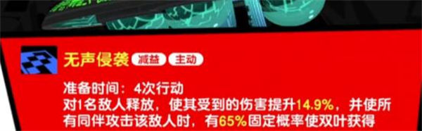 1技能无声侵袭,准备CD4,对单个敌人释放给对方挂上易伤,并且所有同伴攻击这个目标的时候佐仓都有65%概率得到一个线索。基本上是准备回合好了之后就起手用这个技能。