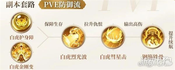 白虎护身障和白虎金刚变保障坦克的生存能力,白虎烈光波具备良好的快速拉升仇恨的效果,白虎彗星击可造成更高的伤害,获得钢筋铁骨后,可以进一步提高作为坦克的续航能力,适用于组队副本、组队首领挑战时作为坦克时携带的技能。