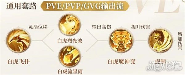 白虎飞扑提供位移,在战斗中更加灵活,白虎烈光波和白虎流星雨可应对大量怪物造成更高的伤害,白虎魔神变可提高自身所造成的伤害,获得虎啸后,可以进一步提高增加自身的伤害值,适用于单人玩法进行战斗。