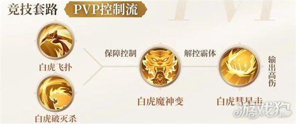 白虎飞扑和白虎破灭杀保障在竞技中的技能控制连段,白虎魔神变可接触敌方控制并获得霸体状态,白虎彗星击可对单体目标造成高额伤害,适用于和魂师进行战斗。
