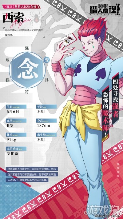 猎人启程西索特征介绍,变化系角色个性一览。要知道,小杰在猎人世界中可是与无数身份各异,性格鲜明之人相遇。而在这其中,就有一位被认为是恐怖的魔术师的人物,身上充满了变化和谜团的他,也是本期角色档案馆的主角—— 西索。