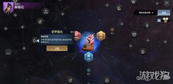 通过升级得到的定制点数,提督们可进入战舰定制界面自由加点,战舰定制根据航海士的专长标签分为三个板块,如薛梨花为遁甲舰、驻防和技能;多尼雅是综合、采集和辅助,每名航海士的专长不同,战舰定制的内容也就不同。