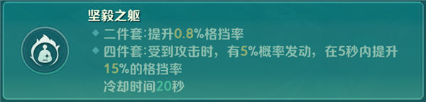 四件套:释放技能时,5%的概率提升15%的格挡率,持续时间5秒,冷却时间20秒。