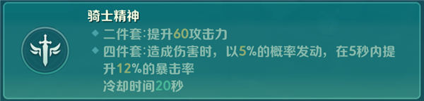四件套:造成伤害时,5%的概率提升自身12%的暴击率,持续时间5秒,冷却时间20秒。