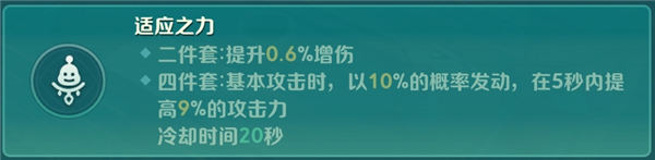四件套:基本攻击时,以10%的概率发动,在5秒内提高9%的攻击力,冷却时间20秒。