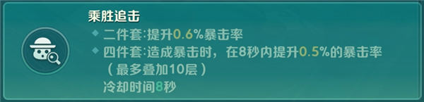 四件套:造成暴击时,在8秒内提升0.5%的暴击率,最多可以叠加10层,冷却时间8秒。