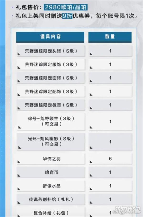 荒野迷踪预售礼包于9月20日(本周三)06:00上架,预售礼包内含荒野迷踪兑换券*1、圣物元件*10,上架时间为一周。