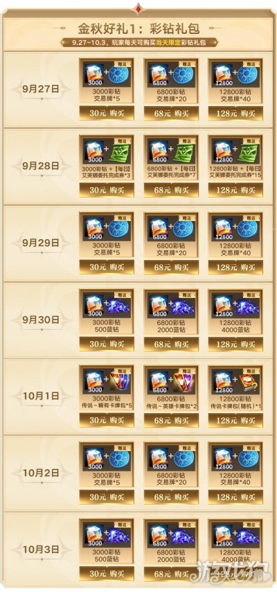 9月27日至10月3日期间,在活动界面购买彩钻礼包,将赠送额外道具。每日均将包含3档礼包,并赠送不同额外道具。每天仅能购买当天限定礼包,超时后将不能购买。