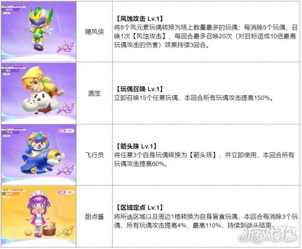 阵容核心是飓风侠,利用飞行员的消除效率频繁触发飓风侠的风蚀攻击,甜点酱加攻击BUFF,最大化飓风侠的风蚀攻击伤害,圆宝可替换成其他风属性玩偶,因为圆宝是新手送的玩偶,所以选择了他。