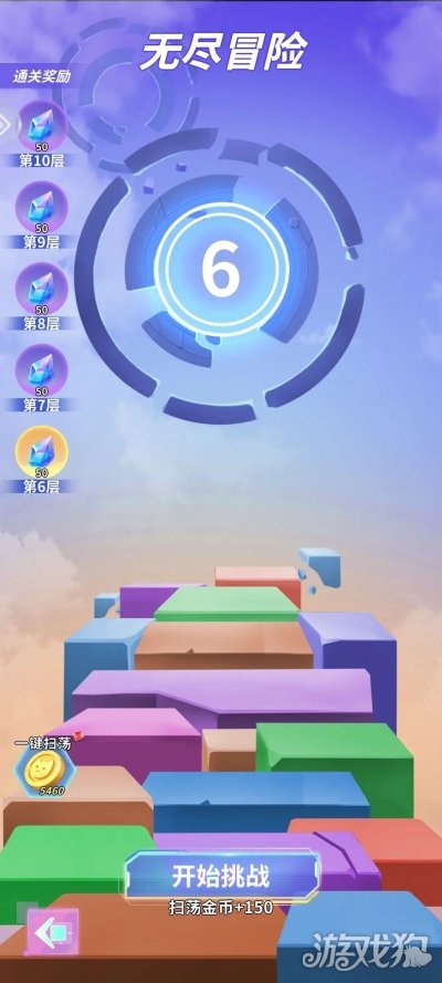 无尽冒险拥有无尽的楼层,每成功挑战一层都能得到钻石奖励,每天扫荡还有金币,层数越高金币越多。
