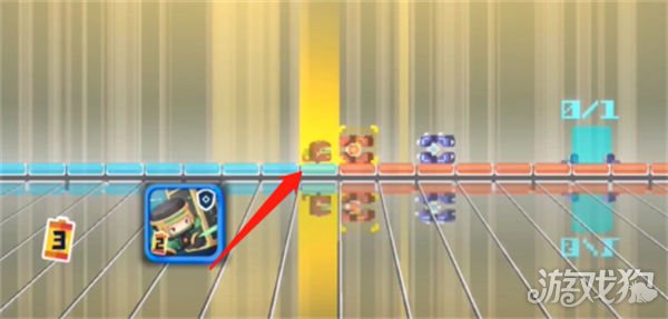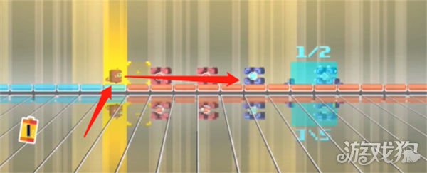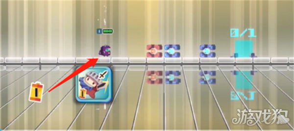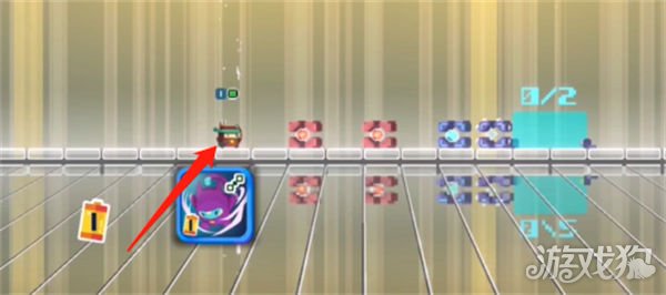 3、然后再奶左侧放置紫猫,可以连续穿过前两个红色芯片,直接将最后一个芯片推到过关处。