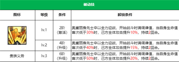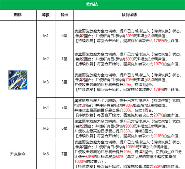 奥黛丽是一个辅助控制类型的技能,大招可以让队伍后排进入持续回复的状态,并且会有70%的概率增加2点调律值。奥黛丽大招一开,我方后卫很快就能可以使用大招了。