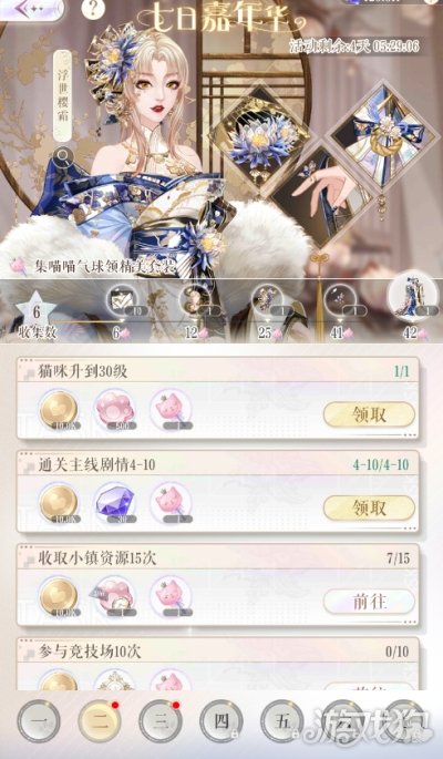 3、完成任务目标可以获得道具奖励和喵喵气球,集齐指定数量的喵喵气球可免费领取丰厚的进度奖励,包含高级时装10连抽及五星精美套装《浮世樱霜》。