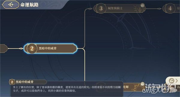 「黑暗中的威胁」节点:目标是使其中一个势力的声望达到100。有三个势力可供选择:「骑士同盟」、「法皇国」和「伊利亚」。至少需要完成一个势力的声望到100,后续才能进行阵营选择。不过在当前版本中,「伊利亚」尚未开放。